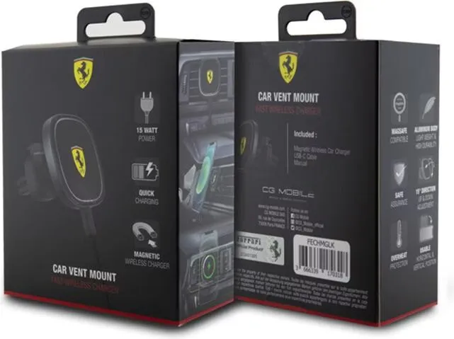 The Ferrari 15W Inductive Car Charger Holder FECHMGLK is an elegant and functional solution for wirelessly charging smartphones while on the go. Designed for the 2023 collection, this product offers seamless integration with MagSafe-compatible devices, particularly the Apple iPhone 12. The holder is made from high-quality ABS material and features a stylish black finish, making it an attractive addition to any vehicle. With compact dimensions of 10 cm in width and 13.5 cm in height, it is ideal for mounting on the dashboard. The lightweight design, weighing only 0.13 kg, ensures that the holder is easy to handle while providing reliable charging performance of up to 15W. This combination of functionality and aesthetics makes the Ferrari inductive car charger holder a practical choice for those who value quality and design.