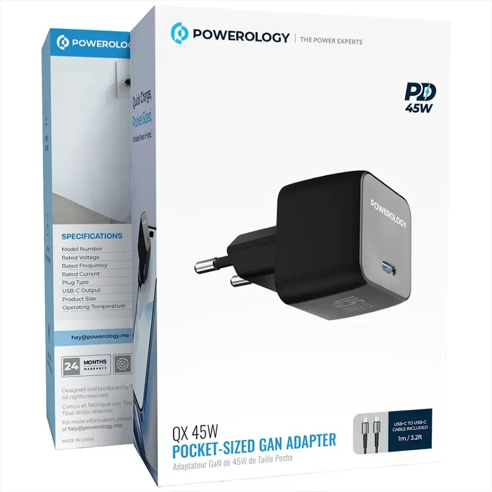 Als leistungsstarker Adapter bietet dieses Ladegerät eine Kombination aus moderner GaN Technologie, schneller Ladeleistung und kompakter Bauweise. Dadurch wird der Powerology QX 45W Single Port Type C EU GaN Adapter C zu C Kabel- Schwarz/Grau zu einer praktischen Lösung für den täglichen Einsatz mit modernen Geräten.