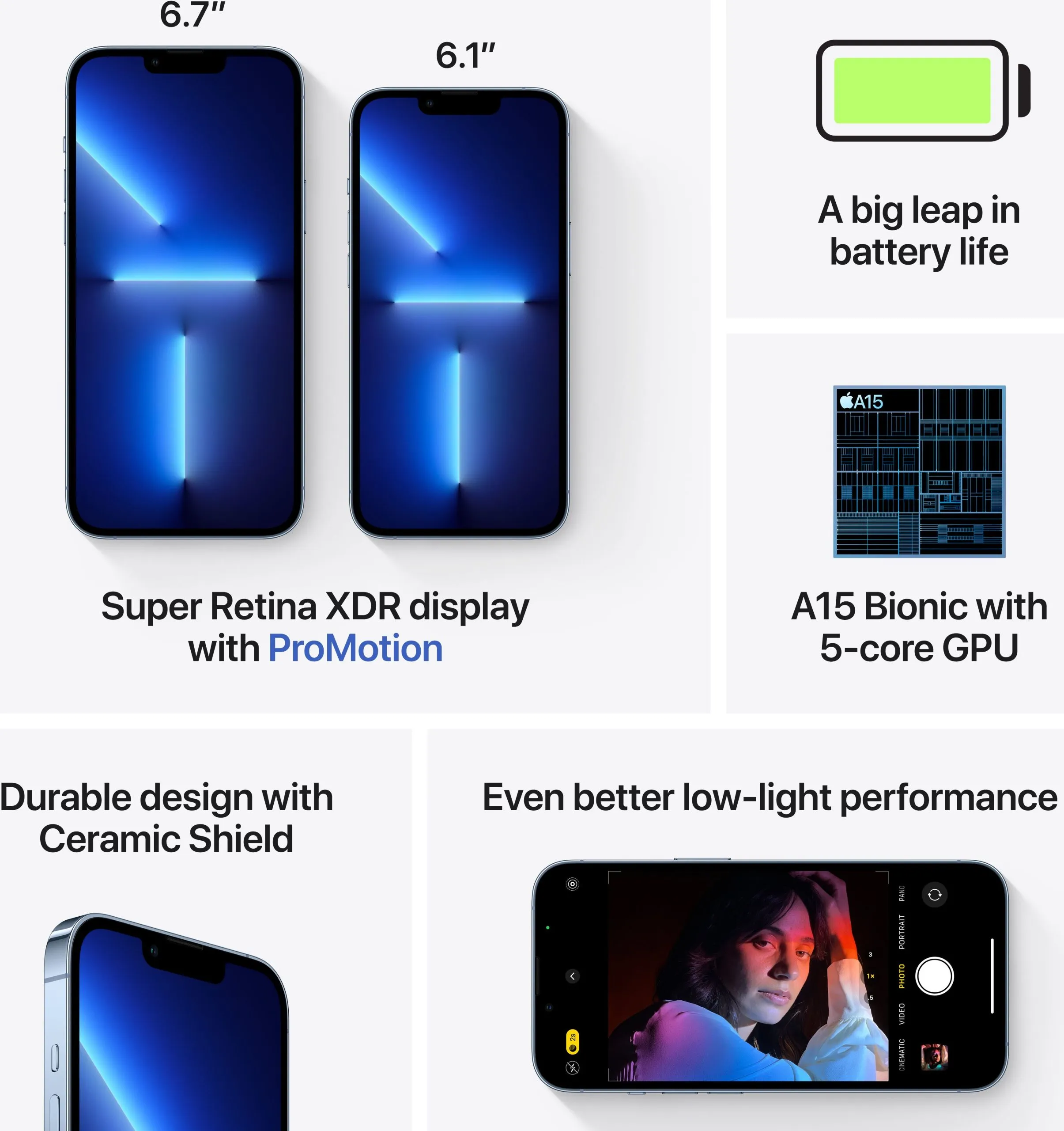 iPhone 13 Pro. Das grösste Upgrade des Pro-Kamerasystems aller Zeiten. Super Retina XDR-Display mit ProMotion für ein schnelleres, reaktionsschnelleres Gefühl. Blitzschneller A15 Bionic Chip. Superschnelles 5G. Robustes Design und ein enormer Sprung bei der Akkulaufzeit. · 6,1-Zoll-Super Retina XDR-Display mit ProMotion für ein schnelleres, reaktionsschnelleres Gefühl · Der Kinomodus fügt geringe Tiefenschärfe hinzu und verschiebt den Fokus in Ihren Videos automatisch · Pro-Kamerasystem mit neuen 12MP-Tele-, Weitwinkel- und Ultraweitwinkelkameras; LiDAR-Scanner; 6-fach optischer Zoombereich; Makrofotografie; Fotografische Stile, ProRes-Video, Smart HDR 4, Nachtmodus, Apple ProRAW, 4K Dolby Vision HDR-Aufnahme · 12 MP TrueDepth-Frontkamera mit Nachtmodus, 4K Dolby Vision HDR-Aufnahme · A15 Bionic Chip für blitzschnelle Leistung · Bis zu 22 Stunden Videowiedergabe · Robustes Design mit Ceramic Shield · Branchenführende Wasserbeständigkeit nach IP68 · 5G für superschnelle Downloads und qualitativ hochwertiges Streaming · iOS 15 bietet neue Funktionen, um mehr mit dem iPhone zu machen als je zuvor · Unterstützt MagSafe-Zubehör zum einfachen Anbringen und schnelleren kabellosen Laden. Datentarif erforderlich. 5G ist in ausgewählten Märkten und über ausgewählte Anbieter verfügbar. Die Geschwindigkeiten variieren je nach Standortbedingungen und Anbieter.