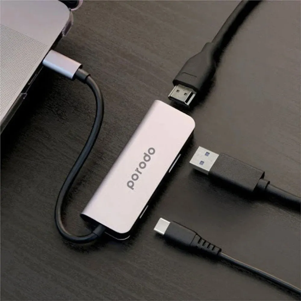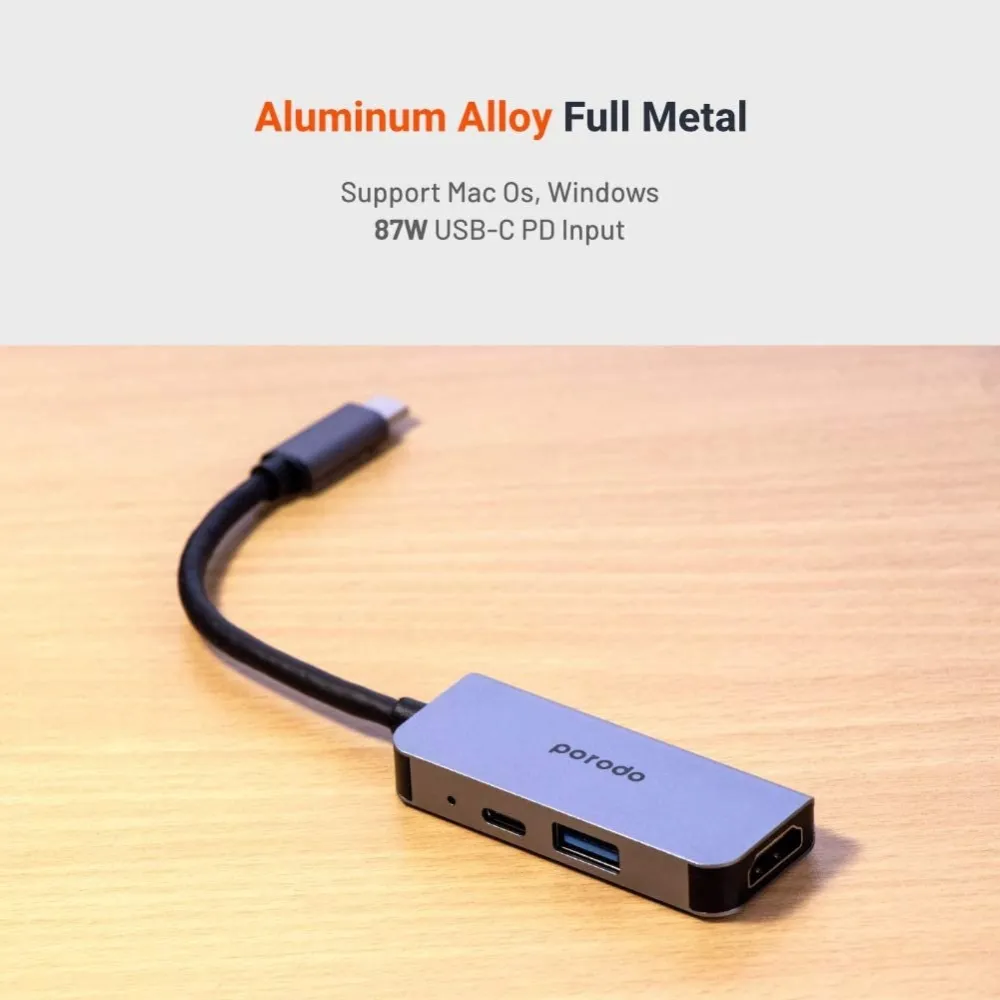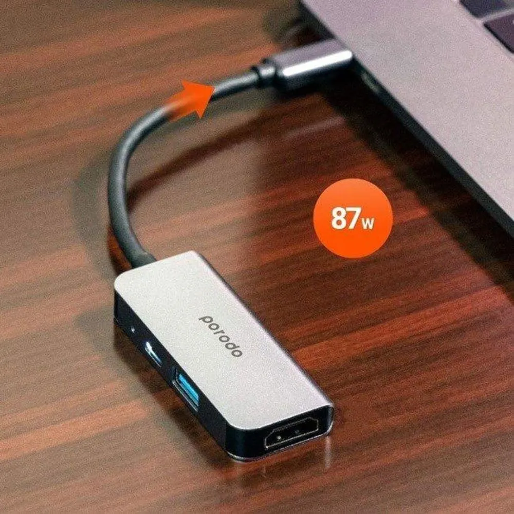 Der Porodo 3 in 1 Aluminium USB-C Hub 4K HDMI PD 87 W - Grau ist mit mehreren Anschlüssen ausgestattet, die eine breite Palette von Geräten unterstützen: