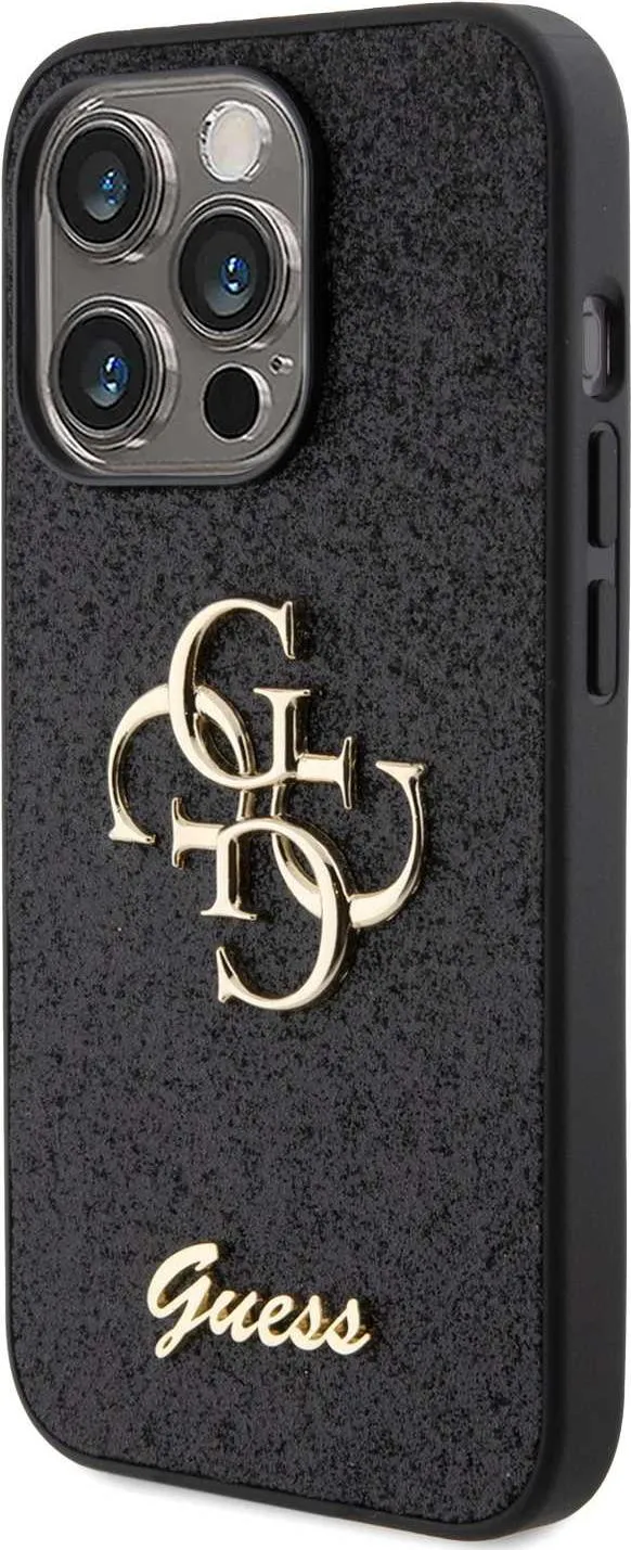 Guess Fixed Glitter Case mit grossem 4G-Logo für iPhone 15 Pro – Schwarz.