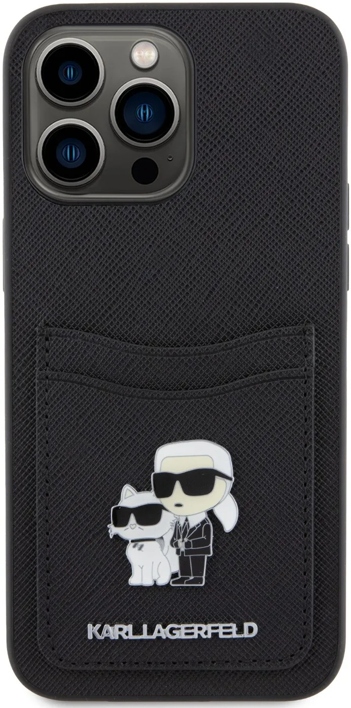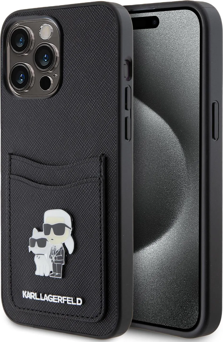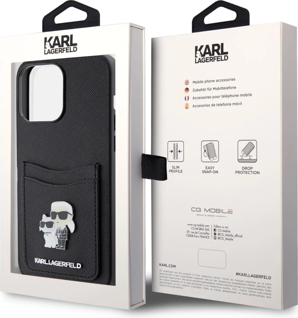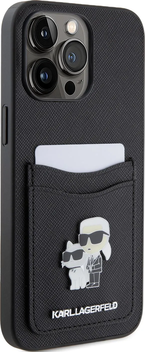 Karl Lagerfeld Saffiano-Hülle mit Kartenfächern und Karl Legerfeld Choupette Heads-Metallpin für iPhone 15 Pro – Schwarz.