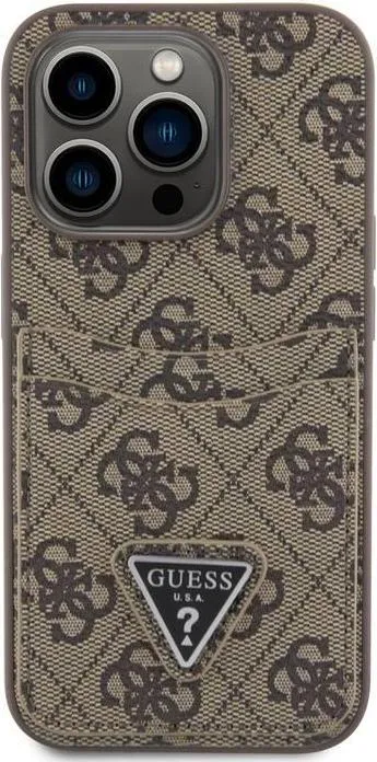 Guess PU-Lederhülle mit doppeltem Kartenfach, 4G-Doppeldreieck-Logo für iPhone 15Pro – Braun.