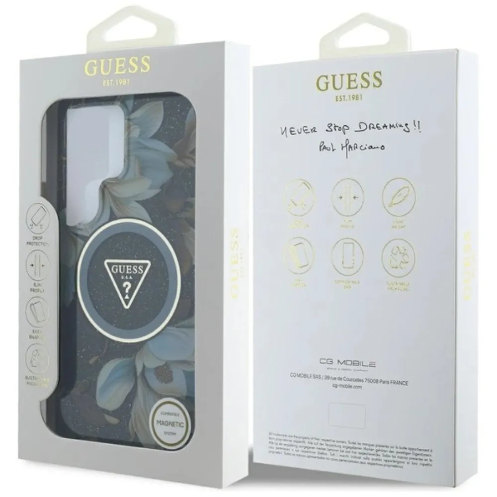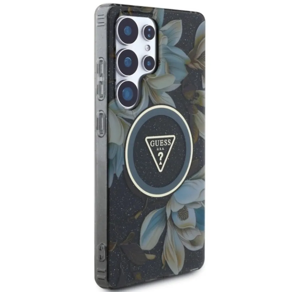 Das Guess Glitter MagSafe Case für Samsung Galaxy S25 Ultra - Schwarz fällt durch das einzigartige Blumenmuster und die glitzernden Akzente auf. Das farbige Blumenmuster sorgt für eine lebendige und fröhliche Optik, während der geometrische Dreieckseffekt dem Gehäuse eine moderne, stylische Note verleiht. Der Glitter-Effekt das Design zum Strahlen und sorgt für einen dynamischen und auffälligen Look.