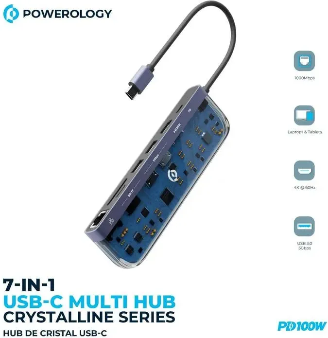 Powerology Crystalline Series 7 in 1 USB-C Hub – Transparent