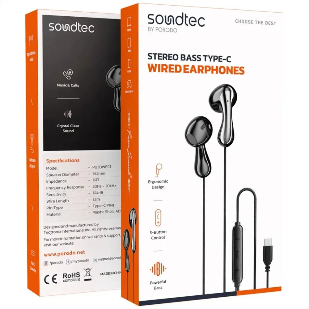 Porodo Typ-C 3 Knopf Kabelgebunden Kopfhörer – Schwarz