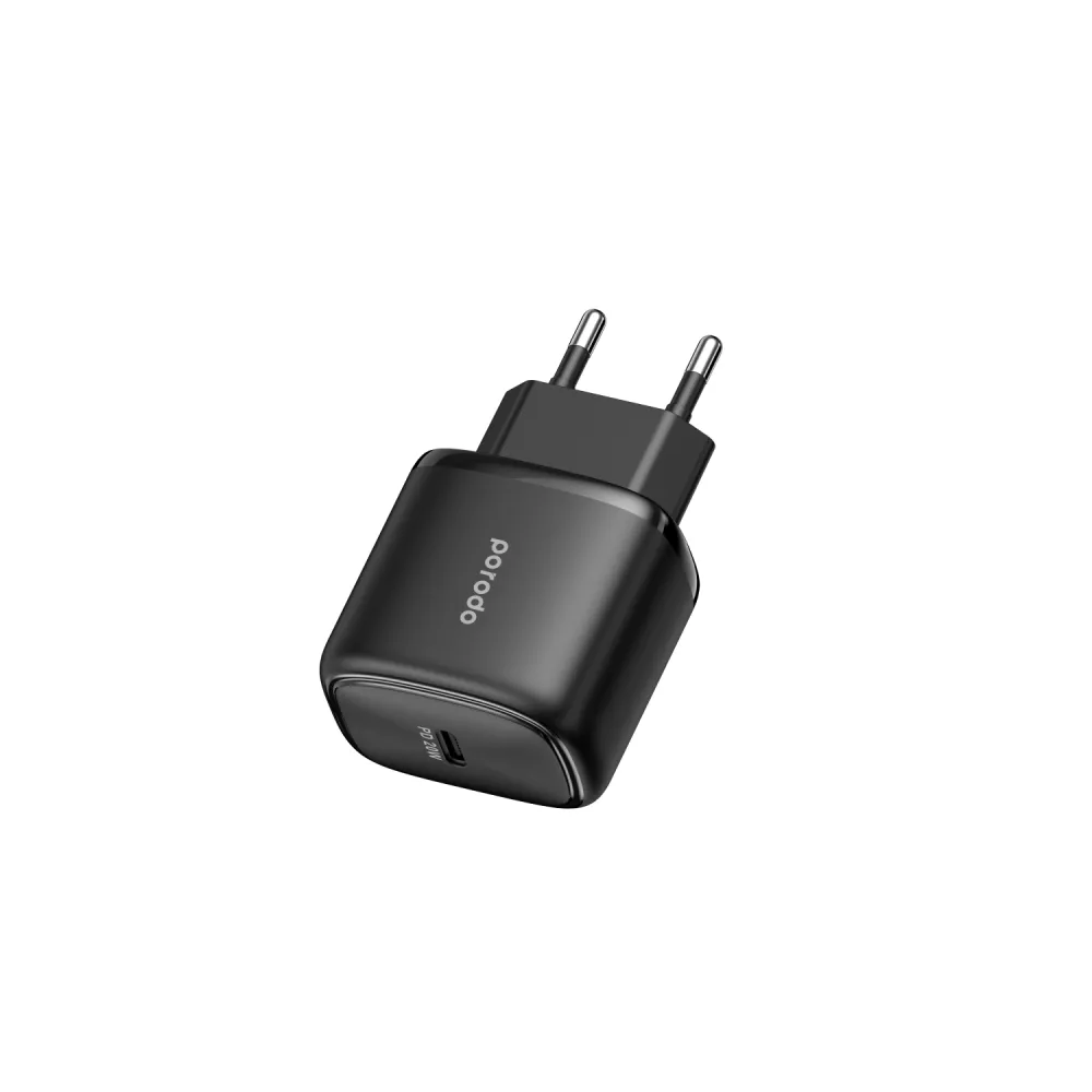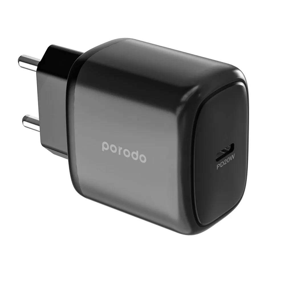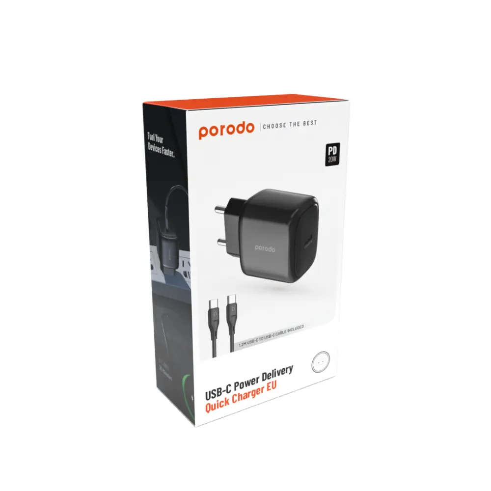Der Porodo 20W Single USB-C Charger EU with C-C 1.2M Cable besticht durch ein minimalistisches, modernes Design in klassischem Schwarz. Die klare Linienführung und das unauffällige Erscheinungsbild machen den Adapter zu einem eleganten Accessoire, das sich perfekt in jede Umgebung einfügt – sei es im modernen Büro, in Ihrem Home-Office oder auf Reisen. - Kompakte Bauweise: