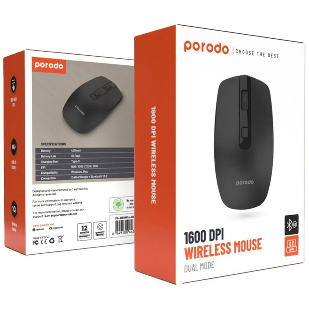 Die robuste Bauweise macht die Porodo Kabellose Bluetooth Maus 2.4G wiederaufladbar 1600 DPI Schwarz zu einer zuverlässigen Wahl.