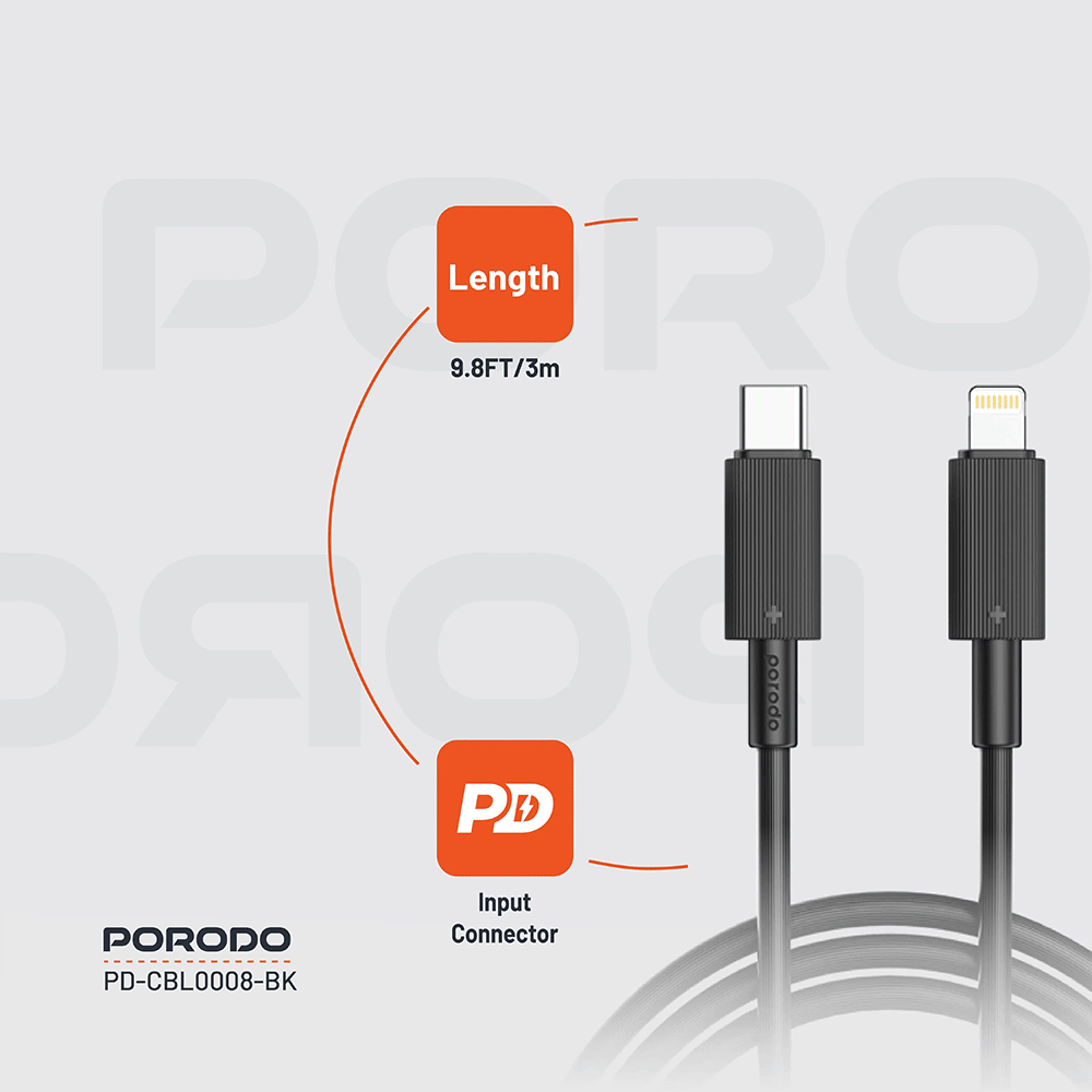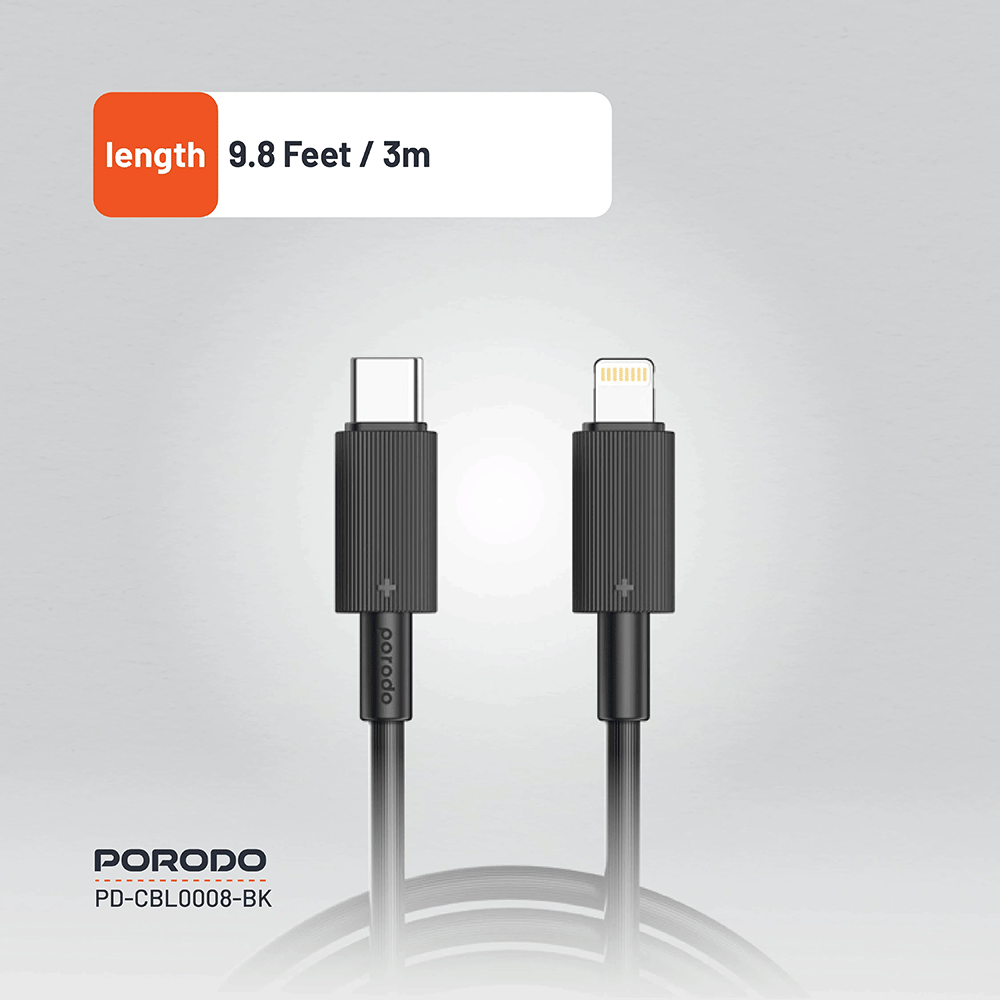 Porodo Typ-C auf Lightning Kabel 3m - Schwarz: Extra Länge für maximale Flexibilität