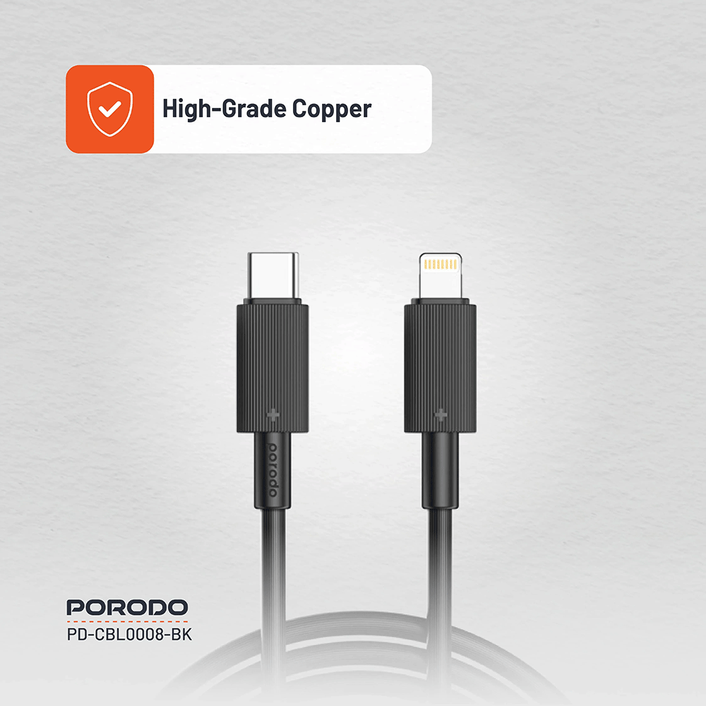 Optisch überzeugt das Porodo Typ-C auf Lightning Kabel 3m - Schwarz mit einer schlichten und modernen schwarzen Farbgebung. Das zeitlose Design passt perfekt zu Apple Geräten und modernen Netzteilen.