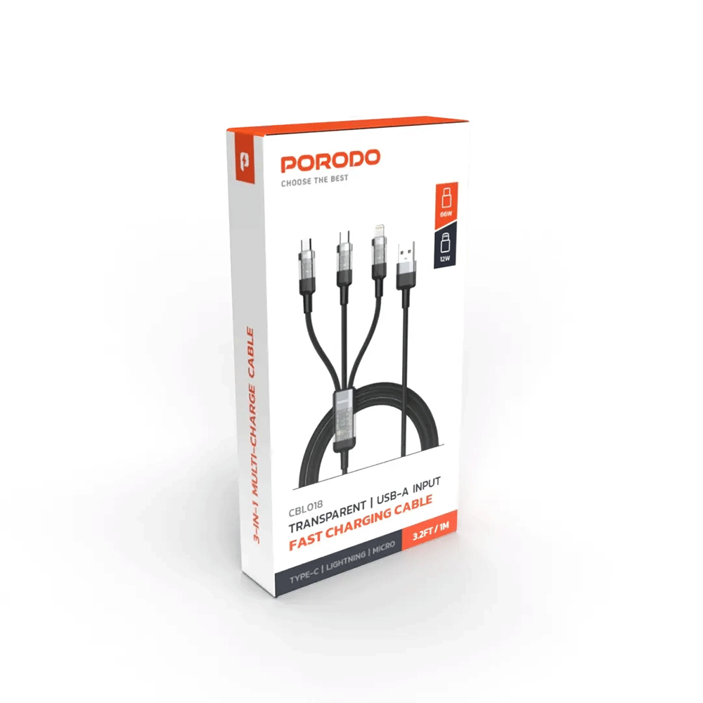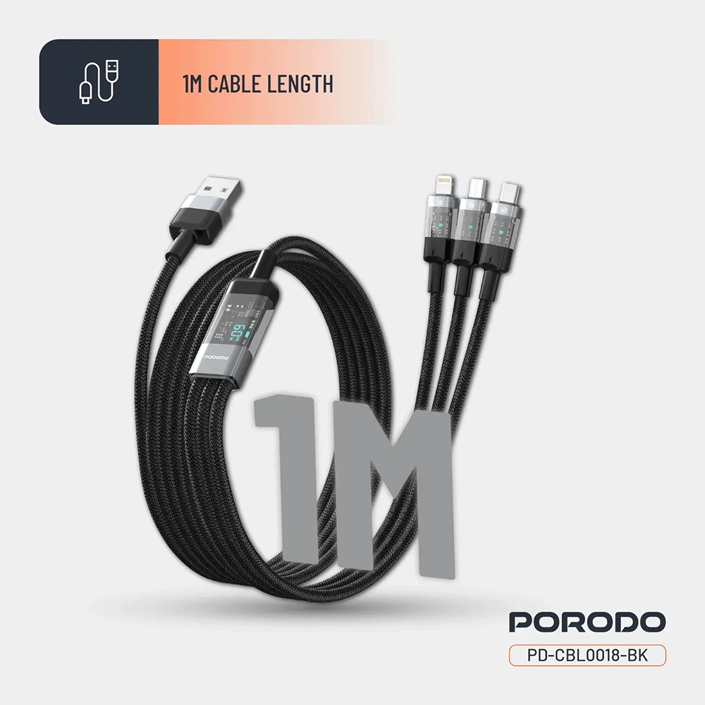 Porodo 4 in 1 Schnellladekabel USB A auf C+L+M 1m - Schwarz: Vielseitige Ladeoption in einem kompakten Kabel