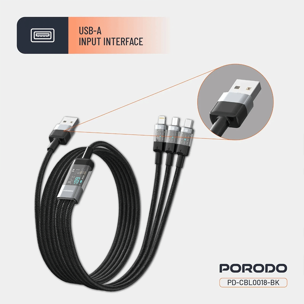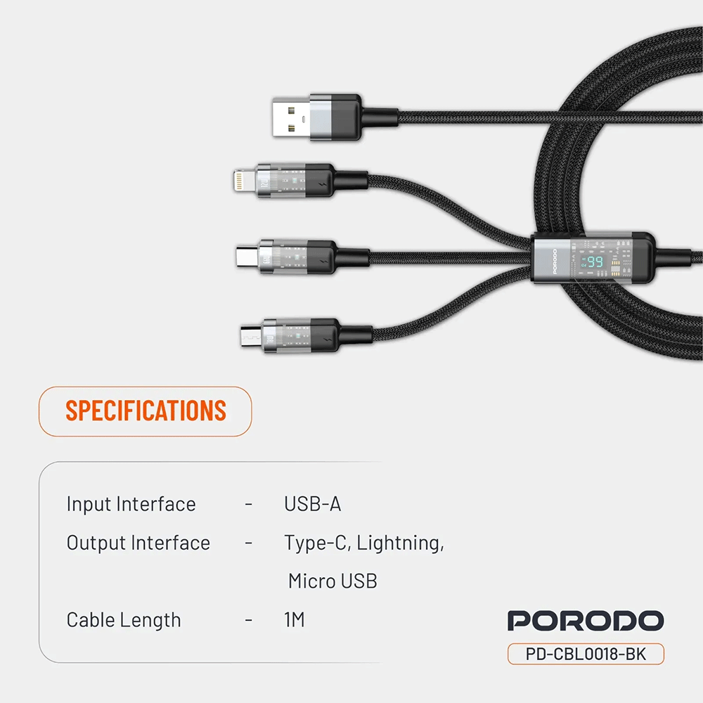 Das Porodo 4 in 1 Schnellladekabel USB A auf C+L+M 1m - Schwarz verfügt über einen USB-A Eingang sowie drei verschiedene Ausgangsoptionen: USB-C, Lightning und Micro-USB. Dadurch kannst du eine Vielzahl moderner und älterer Geräte flexibel laden.