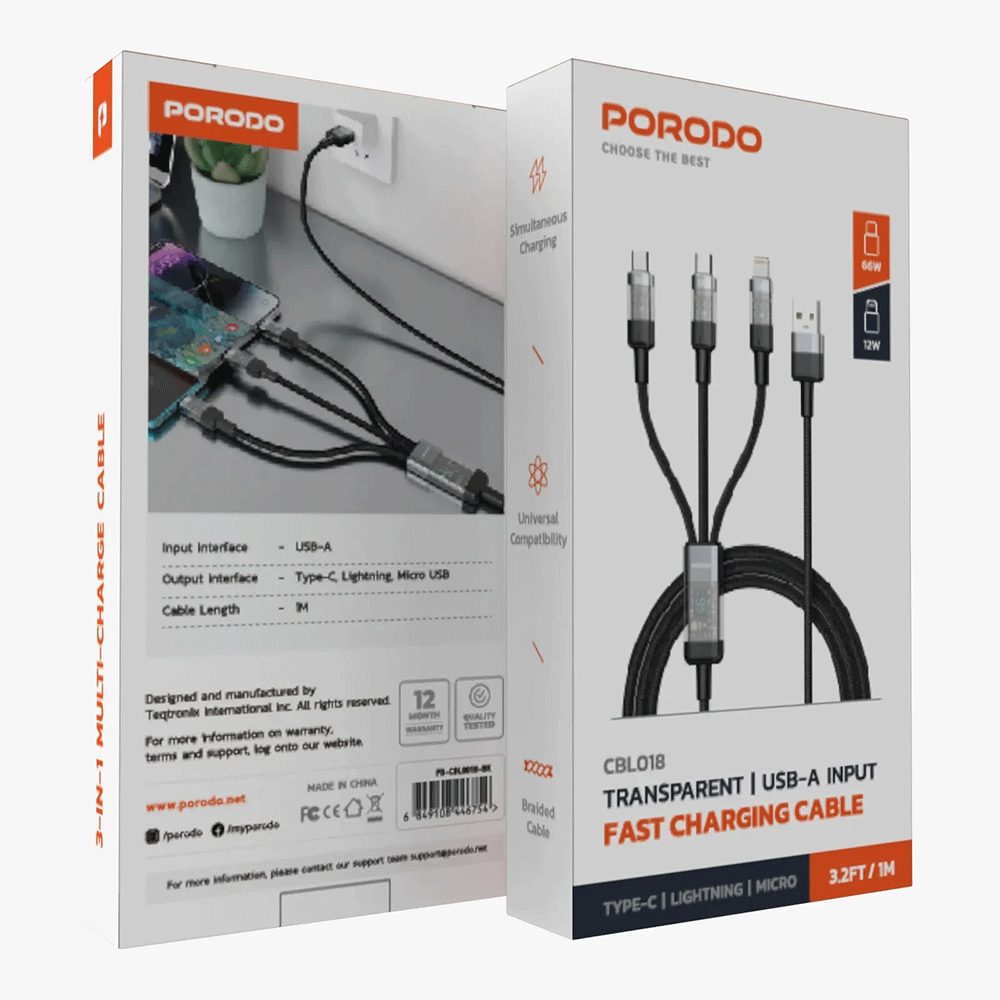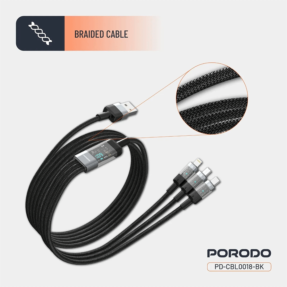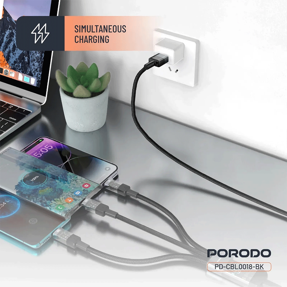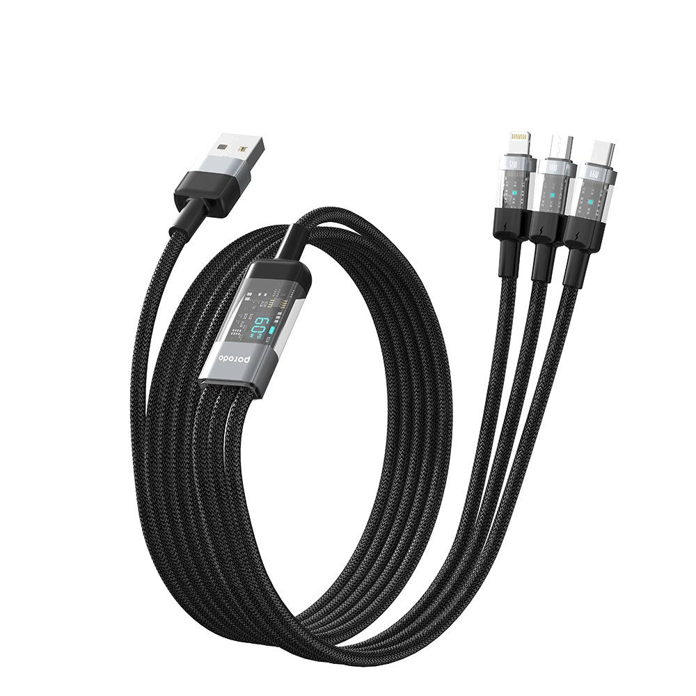 Das Porodo 4 in 1 Schnellladekabel USB A auf C+L+M 1m - Schwarz kombiniert Vielseitigkeit, robuste Verarbeitung und moderne Optik in einem Produkt. Es ersetzt mehrere separate Ladegeräte & Kabel durch eine kompakte Lösung.
