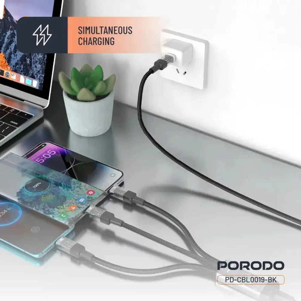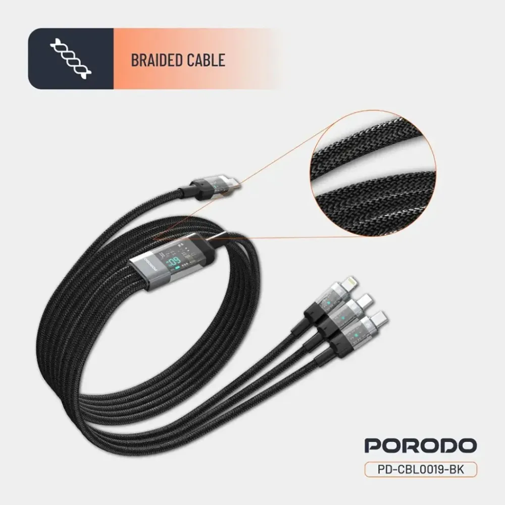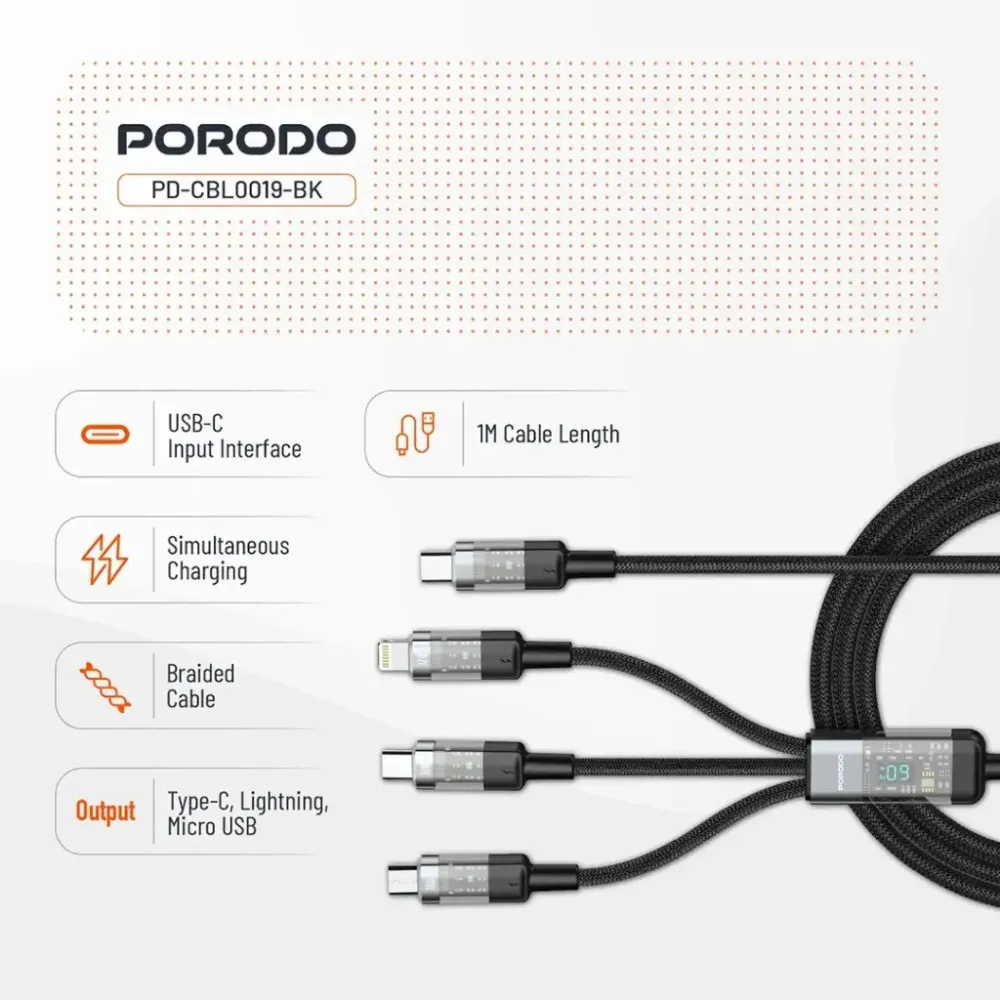 Porodo 4 in 1 Kabel Typ-c auf C+L+M – Schwarz
