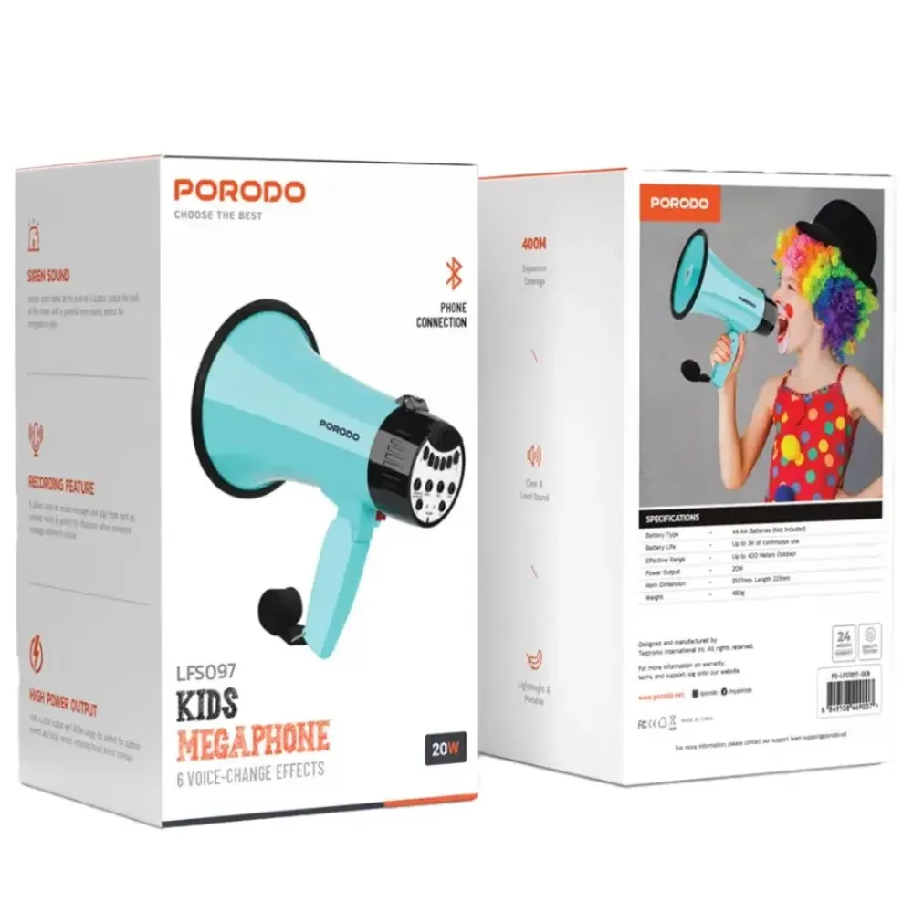 Porodo Lifestyle 30W Sirene Bluetooth Recorder Megaphon mit 6 Sprachmodi – Sky Blue