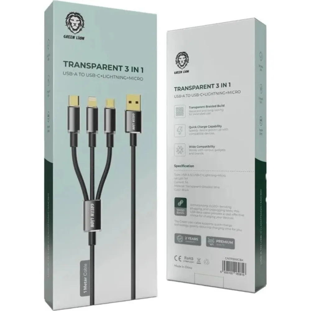 Das Green Lion 3 in 1 Geflochtenes Kabel 1m - Schwarz ist die ideale Lösung für alle, die mehrere Geräte mit unterschiedlichen Anschlüssen flexibel laden möchten. Wenn du praktisches und langlebiges Handy Zubehör suchst, das mehrere Verbindungstypen in einem einzigen Kabel vereint, bietet dir dieses Modell maximale Effizienz. Im Bereich Ladegeräte & Kabel überzeugt es durch Vielseitigkeit, robuste Verarbeitung und ein modernes Design.