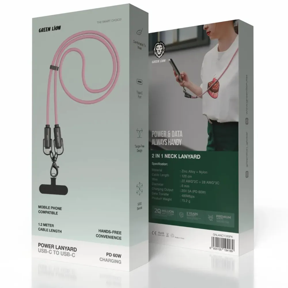 Das Green Lion Power Lanyard C auf C Kabel - Pink kombiniert 60W Schnellladung, robuste Verarbeitung und modisches Lanyard Design in einem Produkt. Es ersetzt klassische Ladegeräte & Kabel durch eine kreative und mobile Lösung.