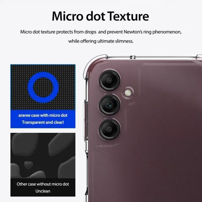 Machen Sie Ihr Handy noch stylischer und schützen Sie es optimal mit der Galaxy A14 5G/4G Schutzhülle aus der Flexield Series von Araree. Dieses in Südkorea mit erstklassiger Qualität gefertigte Galaxy A14 5G/4G Case verfügt über eine angenehme Oberflächenstruktur und verspricht daher eine tolle Haptik. Das Galaxy A14 5G/4G Softcase lässt sich sehr leicht reinigen, ist schmutz- und wasserabweisend und auch Fingerabdrücke haben auf dem hochwertigen Material keine Chance. Die empfindlichen Ecken Ihres Smartphones erhalten durch die Luftpolster im Galaxy A14 5G/4G Backcover zusätzlichen Schutz. Das Galaxy A14 5G/4G Cover verfügt über erhöhte Kanten, um die Kamera Ihres Smartphones besser zu schützen.