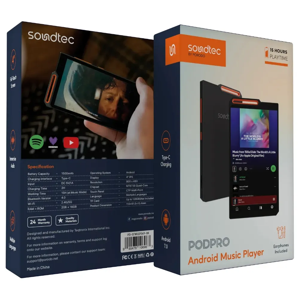 Der Porodo Soundtec Pod Pro Android Musikplayer – Schwarz verfügt über ein hochauflösendes Display (IPS oder vergleichbare Technologie), das klare Farben und gute Blickwinkel bietet. Die Touch-Steuerung ermöglicht intuitives Navigieren in Musikbibliotheken, Apps und Einstellungen.