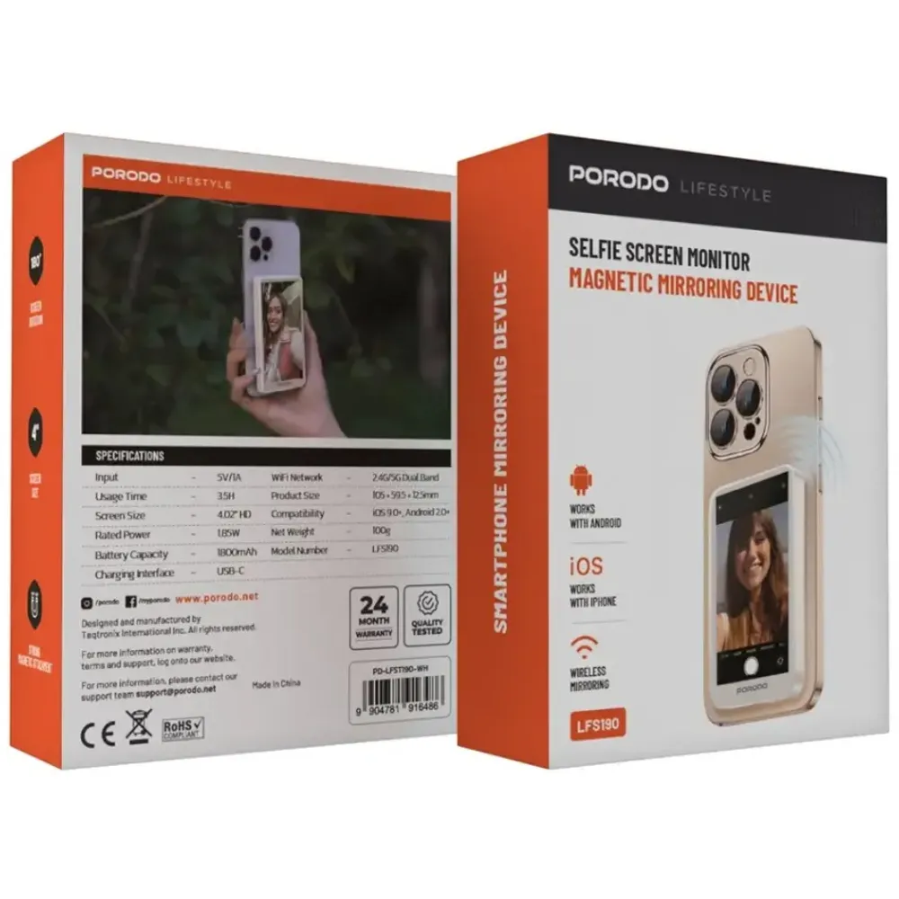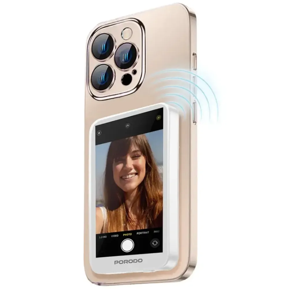 Der Porodo Mobiler magnetischer drahtloser Bildschirmsplitter - Weiss ist eine professionelle Lösung für alle, die Wert auf Bildkontrolle und Flexibilität bei Selfies und Videoaufnahmen legen. Mit HD Display, magnetischer Befestigung, kabelloser Verbindung und leistungsstarkem Akku bringt er Technik und Design in Einklang.
