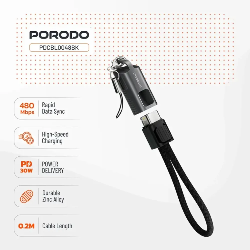 1. Hauptfunktionen des Porodo Chargeloop Schlüsselanhänger Datenkabels USB-C auf Lightning – Schwarz