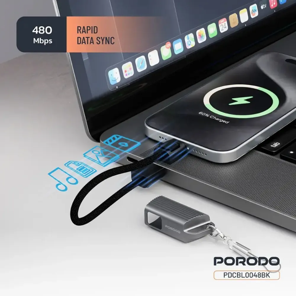 Porodo Chargeloop Schlüsselanhänger Datenkabel USB-C auf Lightning - Schwarz: Ausführliche Produktbeschreibung
