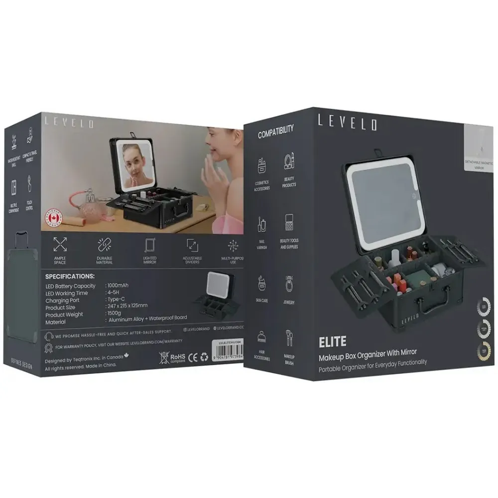 Die Verarbeitung des Levelo Make up Box Organizer Elite Spiegel beleuchtet mit Kosmetik Aufbewahrung wurde auf Stabilität und Langlebigkeit ausgelegt. Die solide Konstruktion sorgt dafür, dass der Organizer auch bei regelmässiger Nutzung seine Form behält.