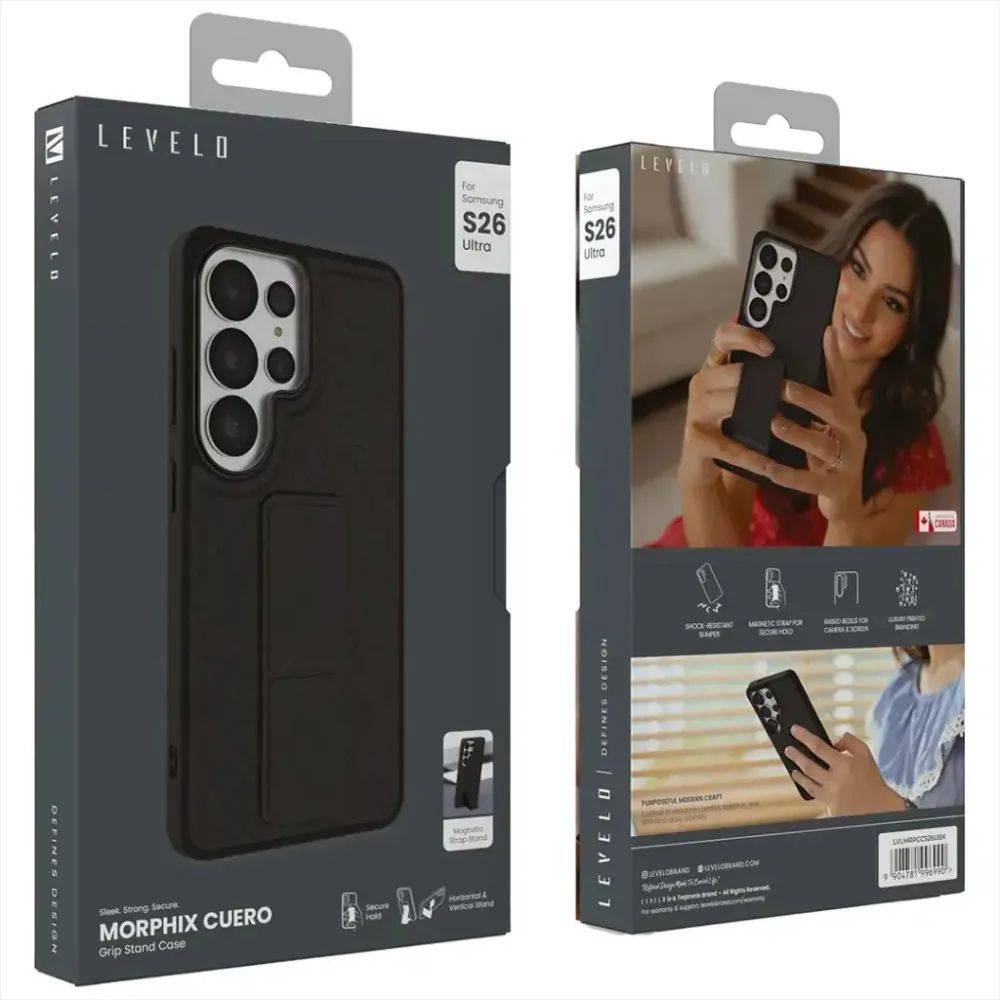 Levelo Morphix Cuero Gripstand Hülle Samsung S26 Ultra – Schwarz