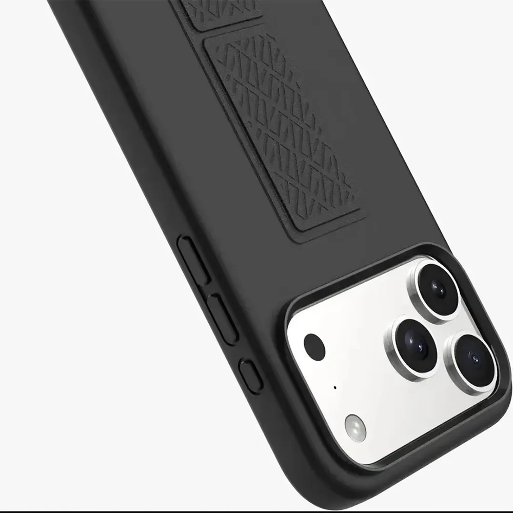 Ein besonderes Highlight der Levelo Morangephix Silikon Hülle Kunstleder mit Griff & Stand Apple iPhone 17 Pro Max Schwarz ist der integrierte Griff auf der Rückseite der Hülle.