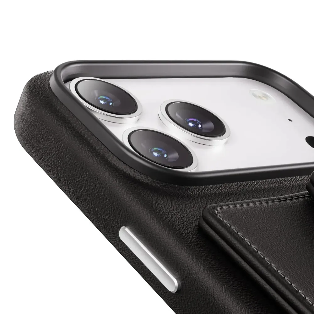 Die Levelo Vertex PU Kunstleder Kartenfach Hülle Apple iPhone 17 Pro - Schwarz besteht aus erstklassigem PU-Kunstleder und strapazierfähigem Polycarbonat, das lange Haltbarkeit und optimalen Schutz gewährleistet: