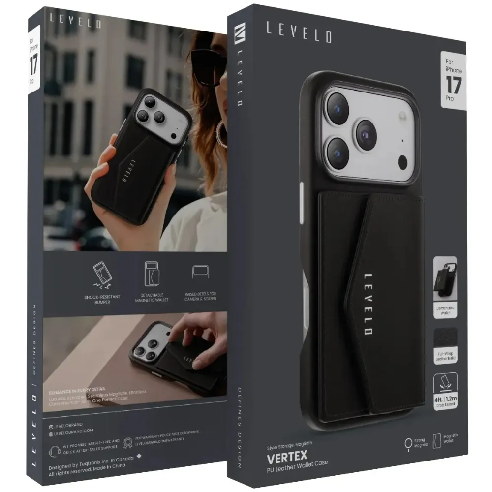Die Levelo Vertex PU Kunstleder Kartenfach Hülle Apple iPhone 17 Pro - Schwarz bietet umfassenden Schutz, praktische Wallet-Funktion und elegantes Design. Mit hochwertigem Material, erhöhtem Display- und Kameraschutz, ergonomischem Slim-Fit-Design und Magnetverschluss ist sie die perfekte Wahl für alle, die ihr iPhone 17 Pro stilvoll, sicher und funktional nutzen möchten.
