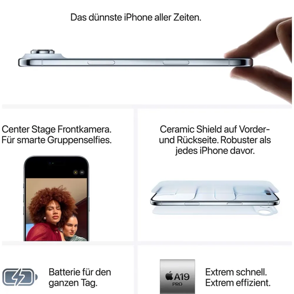 Im Inneren vom iPhone Air Refurbished arbeitet der A19 Chip der im fortschrittlichen Verfahren für maximale Leistung bei minimalem Energieverbrauch gefertigt wurde. Diese CPU ist darauf optimiert die tägliche Nutzung von Apps und Multitasking spürbar flüssiger zu gestalten. Die integrierte Neural Engine sorgt dafür dass KI Prozesse direkt auf dem Gerät verarbeitet werden was dir blitzschnelle Reaktionen und eine personalisierte Nutzererfahrung ermöglicht während das System gleichzeitig die Wärmeentwicklung in dem extrem schlanken Gehäuse perfekt kontrolliert.